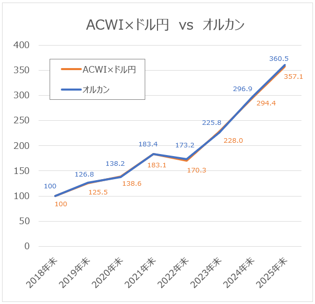 オルカン実績のある2018年末100として比較。2018年から2025年の間は同等に推移していることが確認できる。