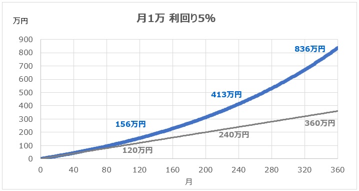 積立投資の特徴は、時間が経つほど増え方が加速することです。