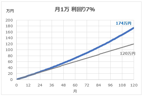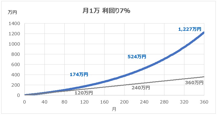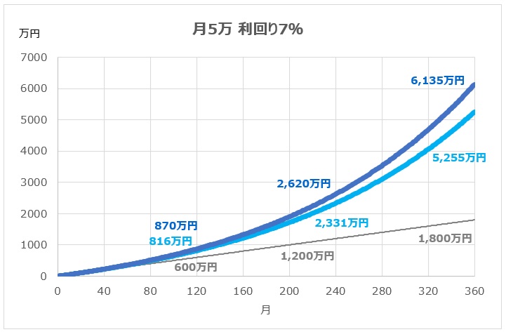例えば、年利7%で運用した場合27年目で1,000万を超える見込みです。